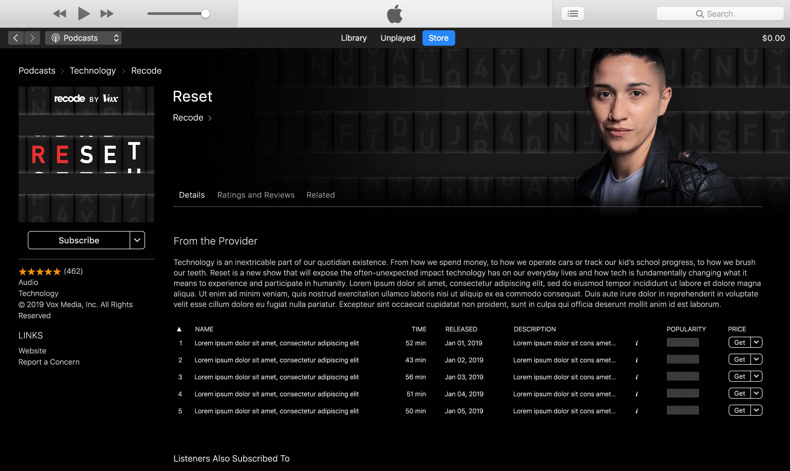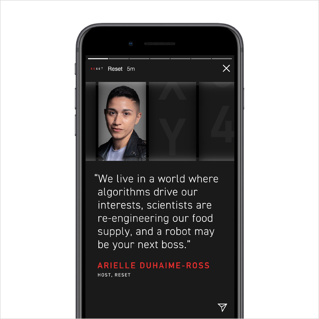 Design system created for the debut of Vox Media Podcast Network’s Reset, a show about the ways that technology is changing humanity and the world. The project included a cover design, digital assets, and print items.